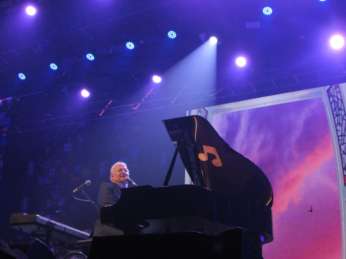 A cenografia era elegante: faixas laterais, grande telão ao fundo e imagens delicadas acompanhando cada canção. Guilherme surgiu impecavelmente vestido com terno azul e seu já tradicional colar em forma de semicolcheia. À direita, o piano Yamaha Clavinova. À esquerda, teclados em formato de escada, prontos para recriar texturas de cinco décadas de música.