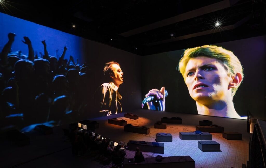 Projeções cobrem todas as paredes do salão cúbico, colocando visitantes no centro das performances. Cada faixa foi remixada para o sistema de áudio espacial da casa, guiando a plateia por diferentes fases da carreira de Bowie. Além dos vídeos, o público verá fotografias, desenhos, letras, anotações pessoais e gravações de voz, organizados em capítulos temáticos apresentados em looping.