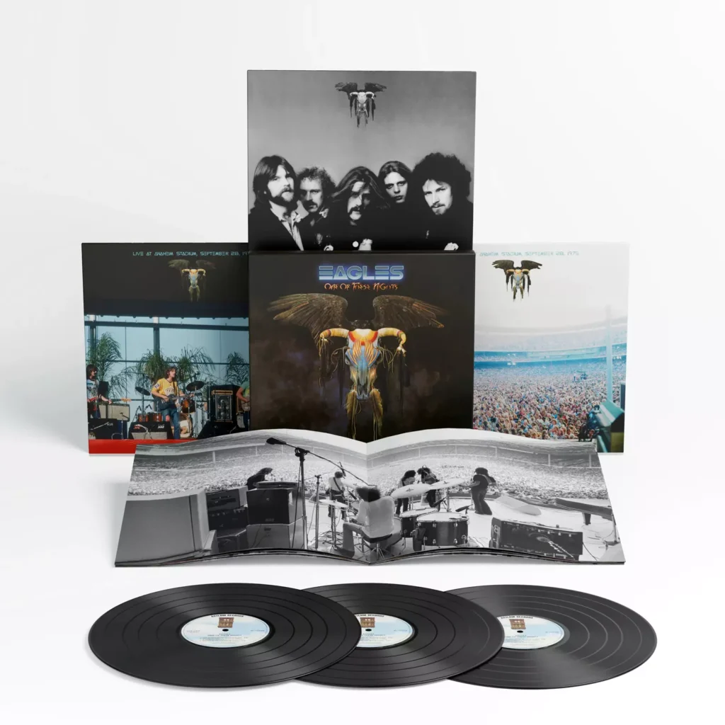 “One of These Nights (Deluxe Edition)” estará disponível em dois formatos: caixa com 3 CDs e 1 Blu-ray, e versão em 3 LPs. Entre as faixas ao vivo estão “Take It Easy”, “Lyin’ Eyes”, “Take It to the Limit” e “Witchy Woman”. O Blu-ray reúne tanto o álbum quanto o show em Atmos e estéreo hi-res.