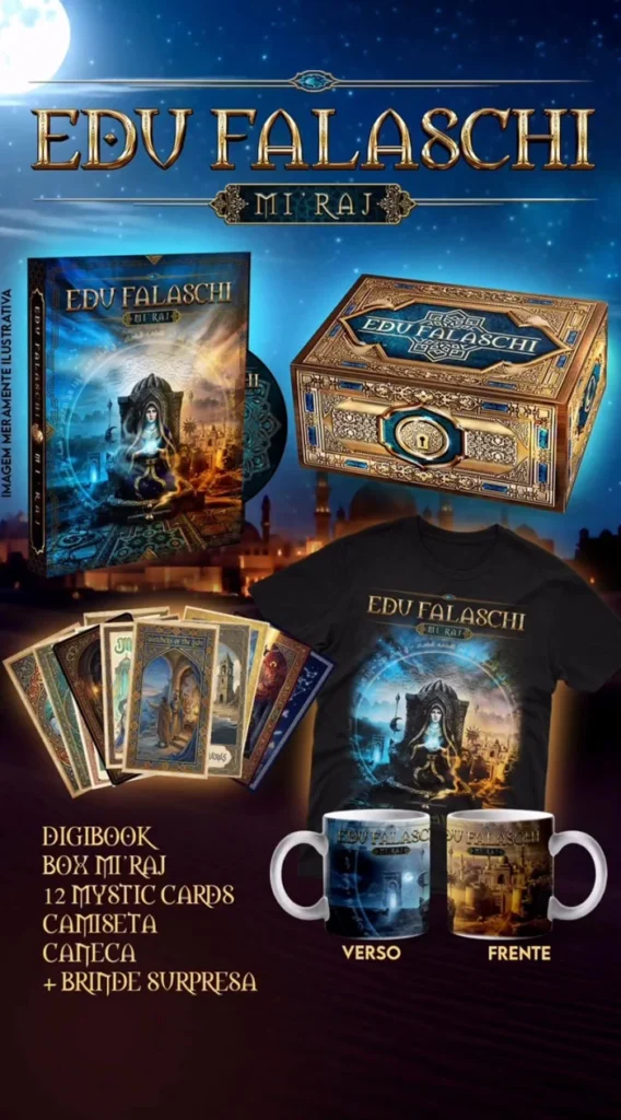 Um box exclusivo e limitado de “Mi’raj” já está disponível para encomenda na lojinha oficial de Edu Falaschi. Ele contém a versão digibook do álbum, camiseta, caneca, um brinde surpresa e 12 Mystic Cards colecionáveis.