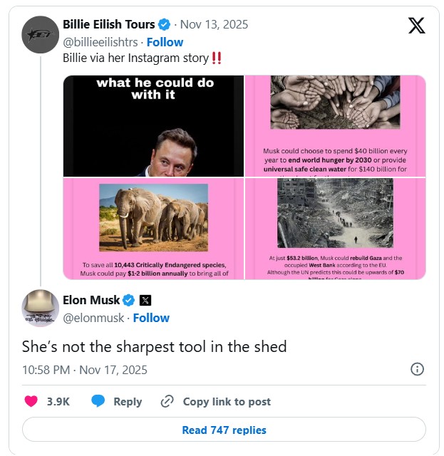 Eilish havia publicado infográficos sugerindo como o patrimônio do executivo, apontado como potencial primeiro trilionário do mundo, poderia erradicar a fome, salvar espécies ameaçadas e reconstruir Gaza. Logo após os gráficos, a artista deixou o xingamento, que viralizou na plataforma.