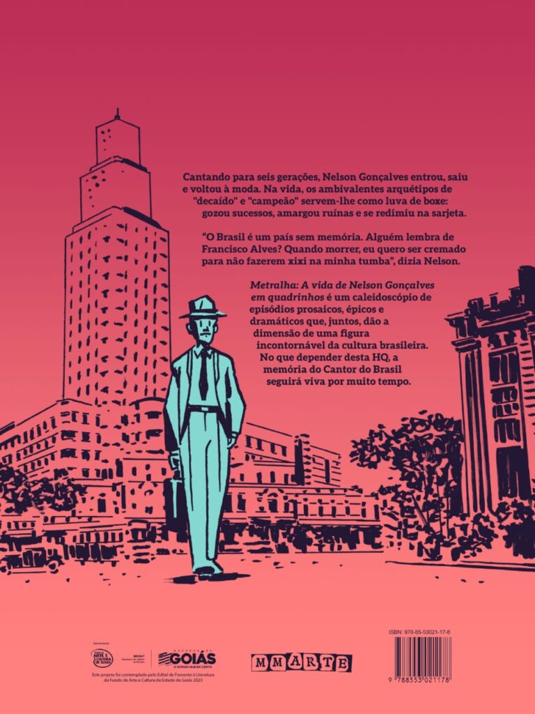 “Metralha: A vida de Nelson Gonçalves em quadrinhos” reúne roteiro de Márcio Paixão Jr., pesquisa do jornalista Cristiano Bastos e arte de Fábio Cobiaco. Publicada pela MMarte editora, a obra foi contemplada pelo Edital de Fomento à Literatura do Fundo de Arte e Cultura do Estado de Goiás 2023. Com 124 páginas, a HQ traz episódios que variam entre o cotidiano, o dramático e o épico, oferecendo uma visão completa de uma figura central da cultura brasileira.
