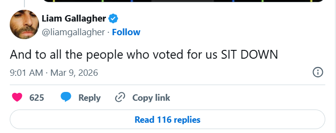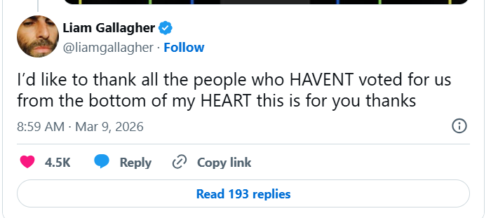 Liam Gallagher ironiza baixa votação do Oasis no Rock Hall ao agradecer, no X, “do fundo do coração”, a todos que ainda não apoiaram a banda na eleição popular para o Rock and Roll Hall Of Fame 2026.