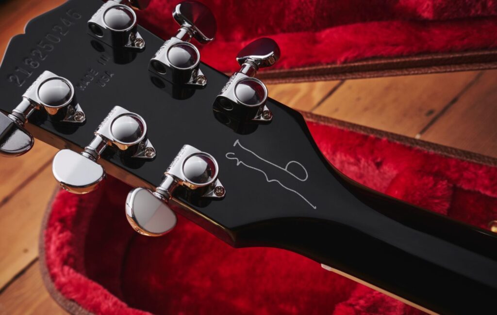 O visual mantém escudo preto de cinco lâminas, inlays trapezoidais e decalque da assinatura de Gallagher na parte traseira da mão. Cada instrumento sai de fábrica em estojo rígido.